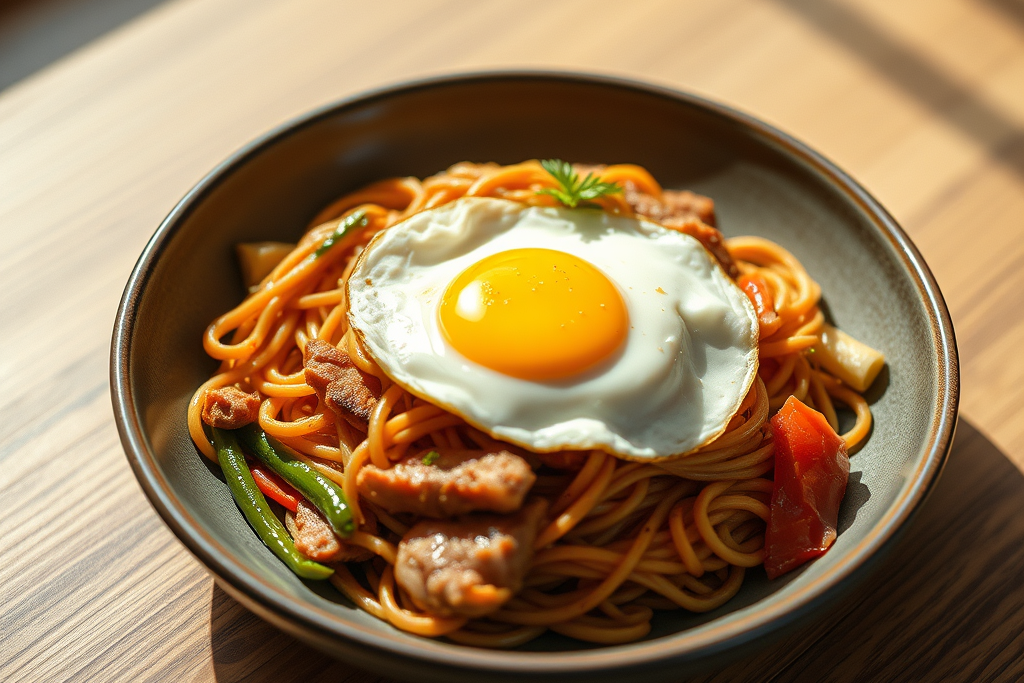 Stir-fried noodles with a medley of vegetables, savory sauce, and your choice of protein for a satisfying meal with fried egg.